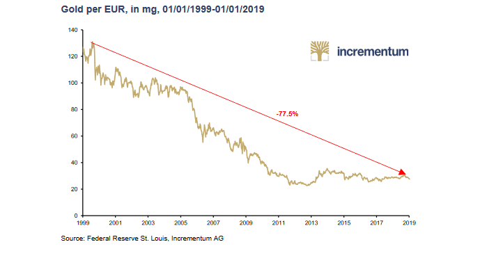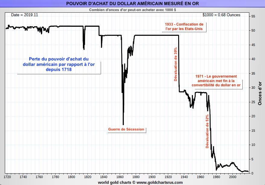 En effet, l’or est un métal monétaire qui a prouvé depuis plusieurs millénaires sa capacité à constituer une réserve de valeur. Le pouvoir d’achat de l’or est stable sur le long terme contrairement à celui des monnaies fiducières (euros, dollars canadiens, USD, etc.). L’or ne peut pas être imprimé, sa performance reflète en réalité la baisse du pouvoir d’achat des monnaies.